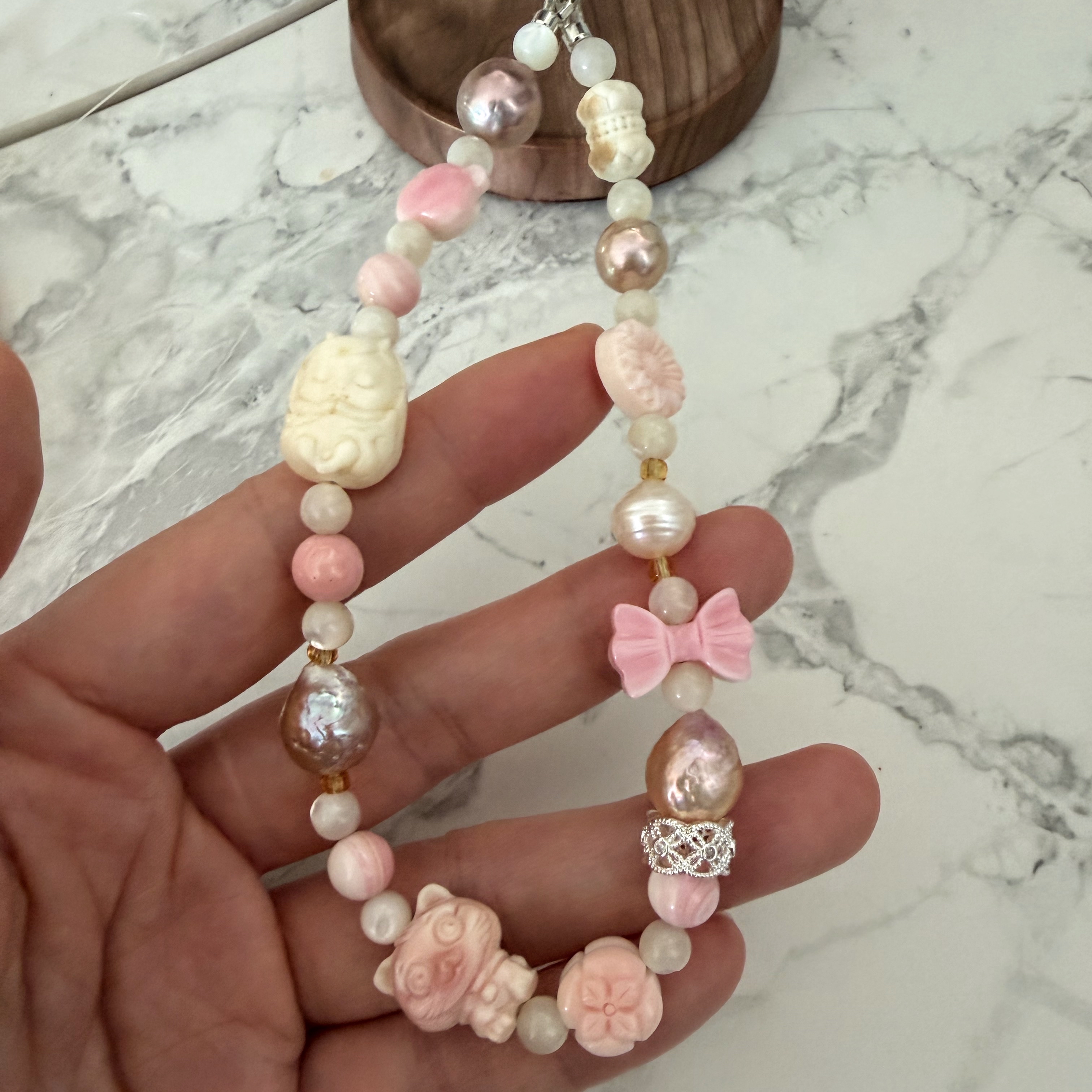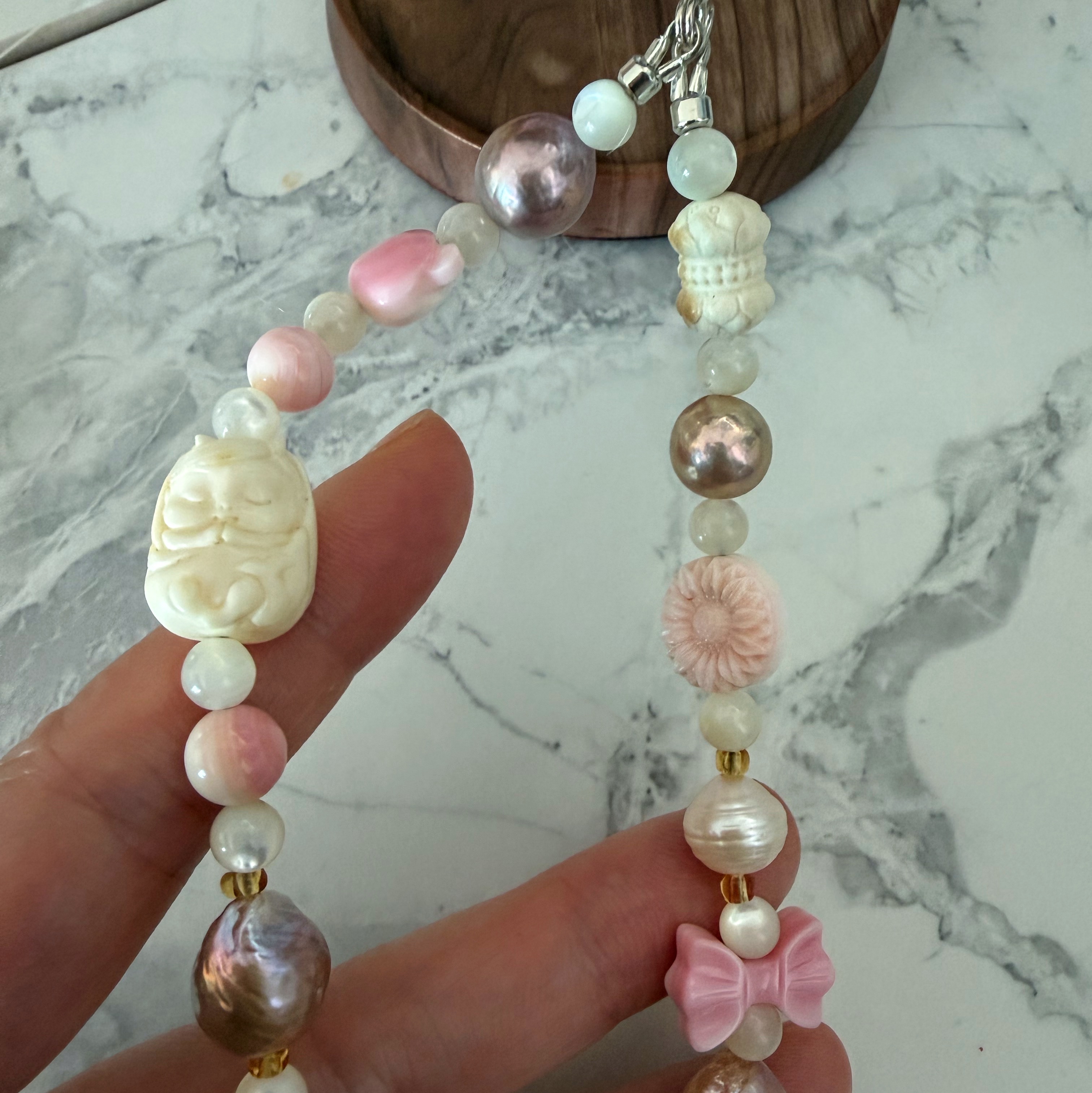 天然無優化之胭脂螺/淡水珍珠/猛犸象牙/白貝母 獨家設計款式,天然保真 ~~*~~*~~*~~*~~*~~*~~*~~*~~*~~*~~ 售前須知: 1.本店寶貝一律實物拍攝,由於受光線影響及顯示器原因,難免存在色差,需要視頻看細節請DM店主。 2.尺寸為人工粗略測量,可能存在微誤差,但懇請唔好憑想像估測。 3.天然產品難免存在石紋礦坑雜質等天然特性,此非瑕疵,請知悉。 4.手工制作無可避免燒結黏膠等痕跡,完美主義者慎選。 5.全店僅限順豐,一旦發貨,唔退唔換。